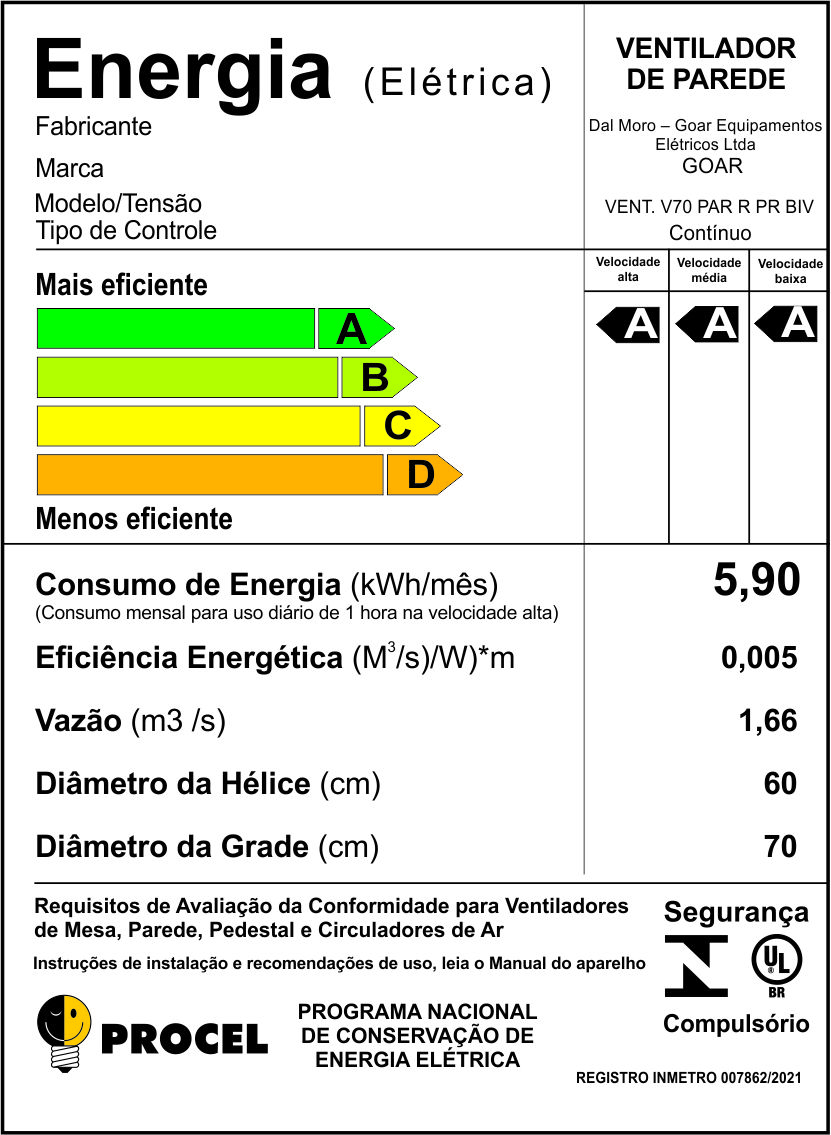 Ventilador de Parede 70cm V70P...